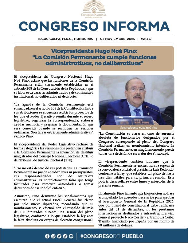 El vicepresidente del Congreso Nacional, Hugo Noé Pino, aclaró que las funciones de la Comisión Permanente están claramente establecidas en el artículo 208 de la Constitución de la República, y que su labor es de carácter administrativo y de continuidad institucional, no deliberativo ni decisorio. “La agenda de la Comisión Permanente está enmarcada en el […]