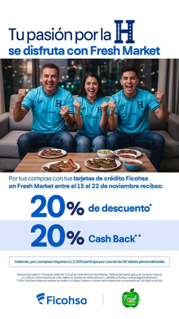 Prepara todo para disfrutar el partido de nuestra Selección Nacional, mientras vives la experiencia gourmet en Fresh Market y aprovechas beneficios exclusivos para tarjetahabientes Ficohsa: 20% de descuento, 20% de cashback y, por compras mayores a L2,500, participa por una de las 50 tablas personalizadas. En Fresh Market encontrarás desde cortes premium de Certified Angus […]