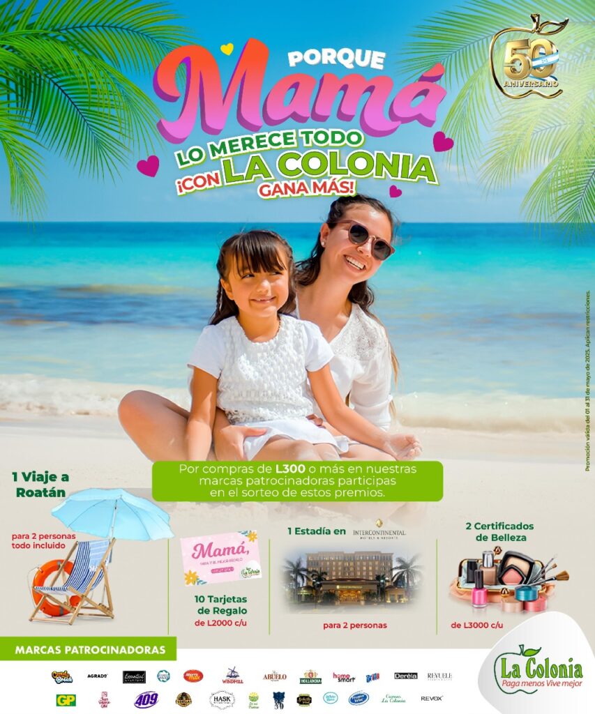 “Porque mamá lo merece todo ¡con La Colonia gana más!” Con tus compras, la reina del hogar puede ser la afortunada ganadora de un viaje, kits de belleza y más