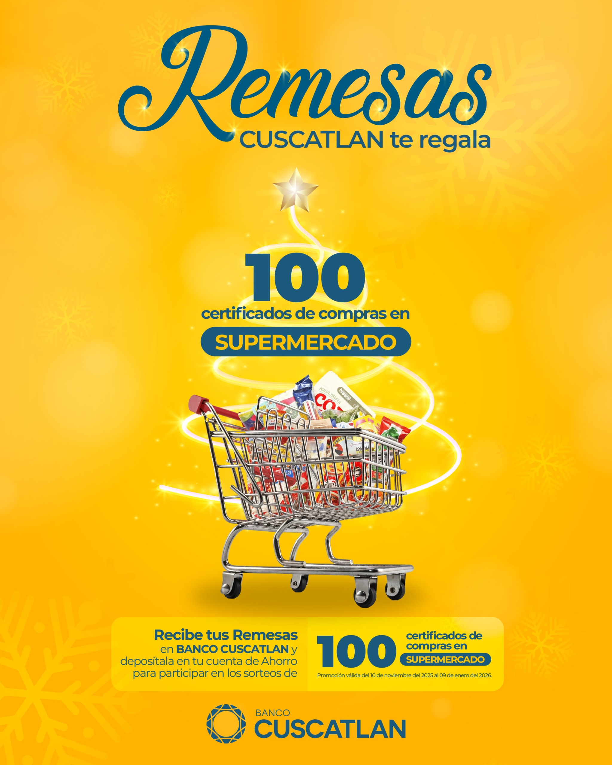 Durante el período promocional, los clientes que Cobren sus Remesas y las depositen en su Cuenta de Ahorro CUSCATLAN participarán automáticamente en el sorteo de 100 certificados de consumo en supermercados, valorados en L1,000.00 cada uno, ideales para compartir y disfrutar en familia durante las celebraciones de fin de año.