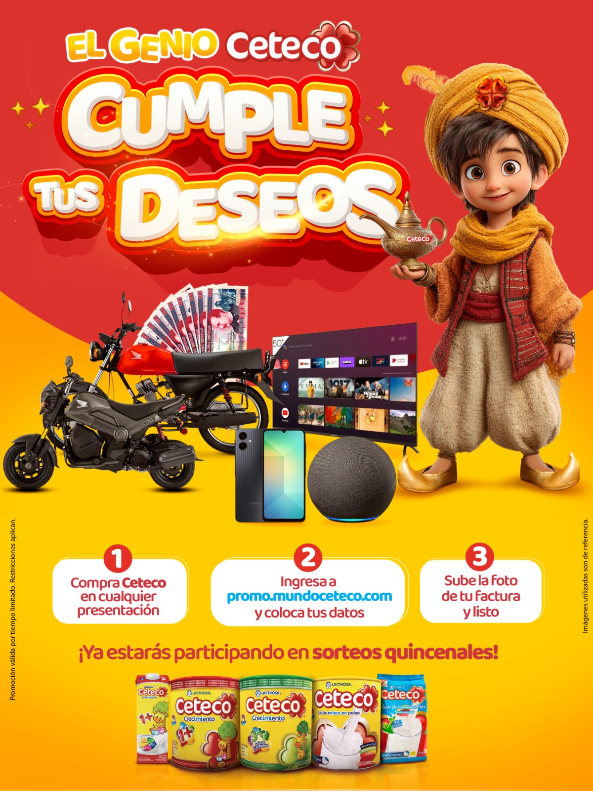 A través de esta super promoción ¡El Genio Ceteco Cumple Tus Deseos! tendrás la oportunidad de participar en sorteos quincenales de: motos, televisores, celulares, parlantes inteligentes y mucho dinero en efectivo. Tú puedes ser UNO de los ganadores de los 33 premios que el Genio Ceteco sorteará en esta única promoción que solo Ceteco te puede traer.