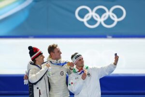 Foto 2: El medallista de oro Sander Eitrem (Noruega), el medallista de plata Metodej Jilek (Chequia) y el medallista de bronce Riccardo Lorello (Italia) se toman una selfie de la victoria con el Samsung Galaxy Z Flip7 Olympic Edition tras la ceremonia de entrega de medallas de los 5000 m masculinos de patinaje de velocidad. (Foto de Sarah Stier/Getty Images)