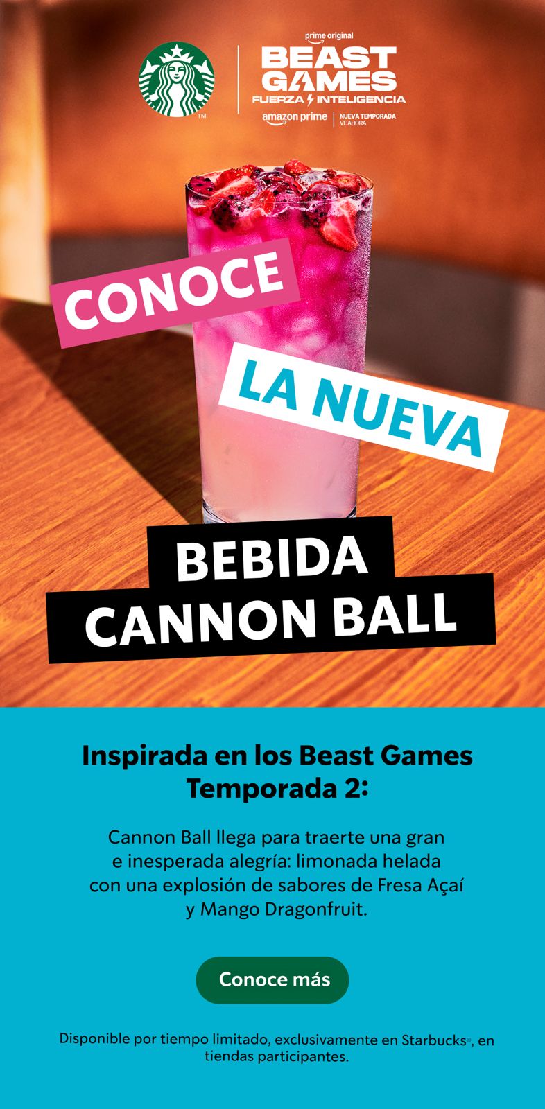 Creada por baristas Starbucks para los fans, la bebida Cannon Ball es una limonada intensa y ligeramente ácida elaborada con los Starbucks® Strawberry Açaí y Mango Dragonfruit Refreshers, servida bien fría y coronada con inclusiones de fruta en cascada. Inspirada en el icónico Cannon Ball Challenge de Beast Games temporada 2, esta vibrante bebida ofrece una explosión refrescante de sabor y un gran impacto visual. Disponible por tiempo limitado, invita a los clientes a lanzarse y disfrutar el momento mientras dure.