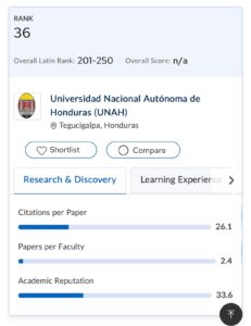 Universidad Nacional Autónoma de Honduras (UNAH), así como la posición #36 en